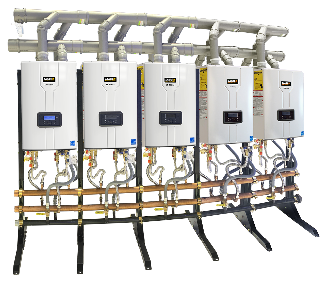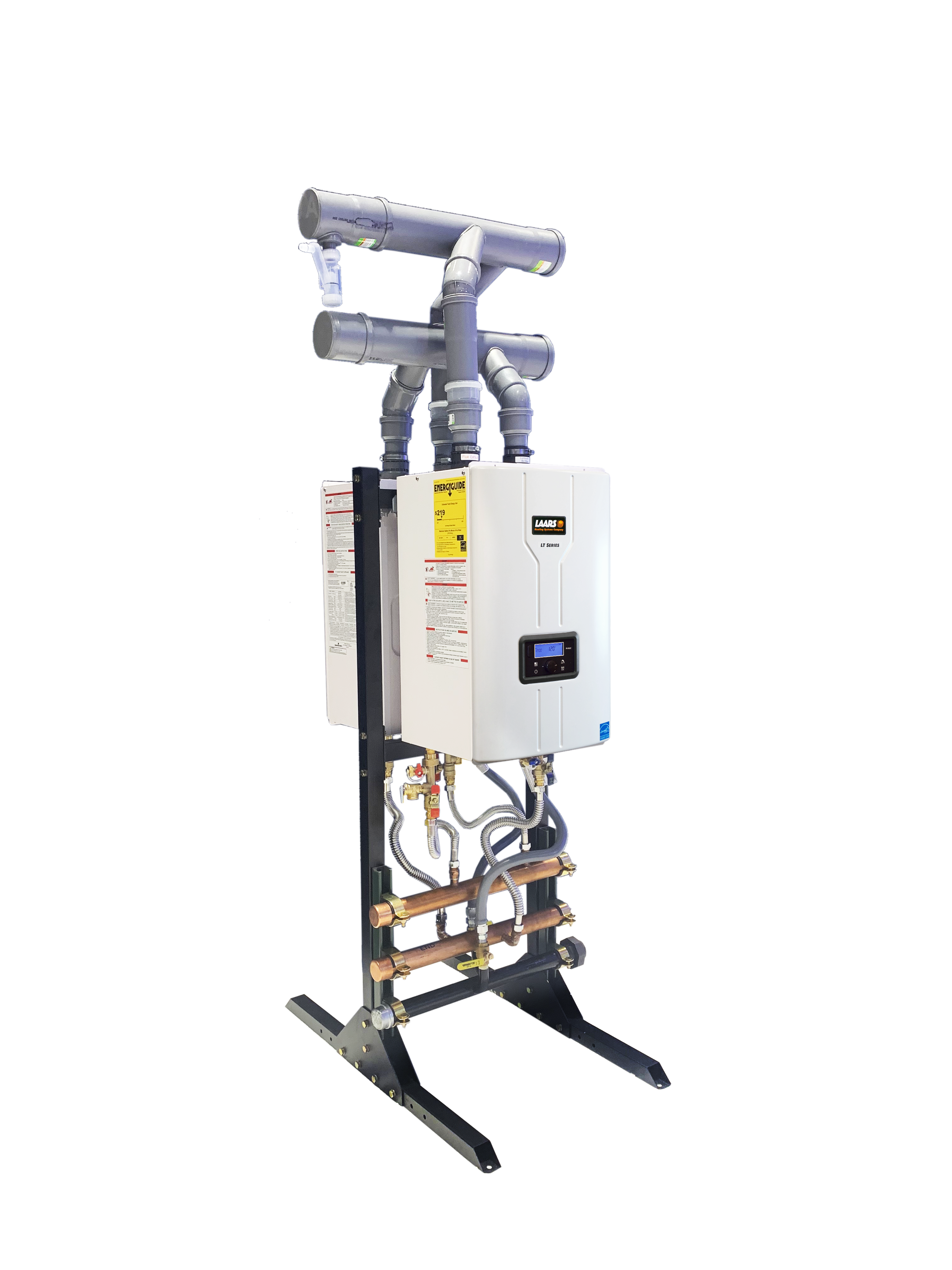 Kit includes: Inlet and outlet water pipe manifolds, gas pipe manifold, 150 psi PRV, shut off valves, end caps, mounting struts and pipe clamps, and coupling, unions and adapters.