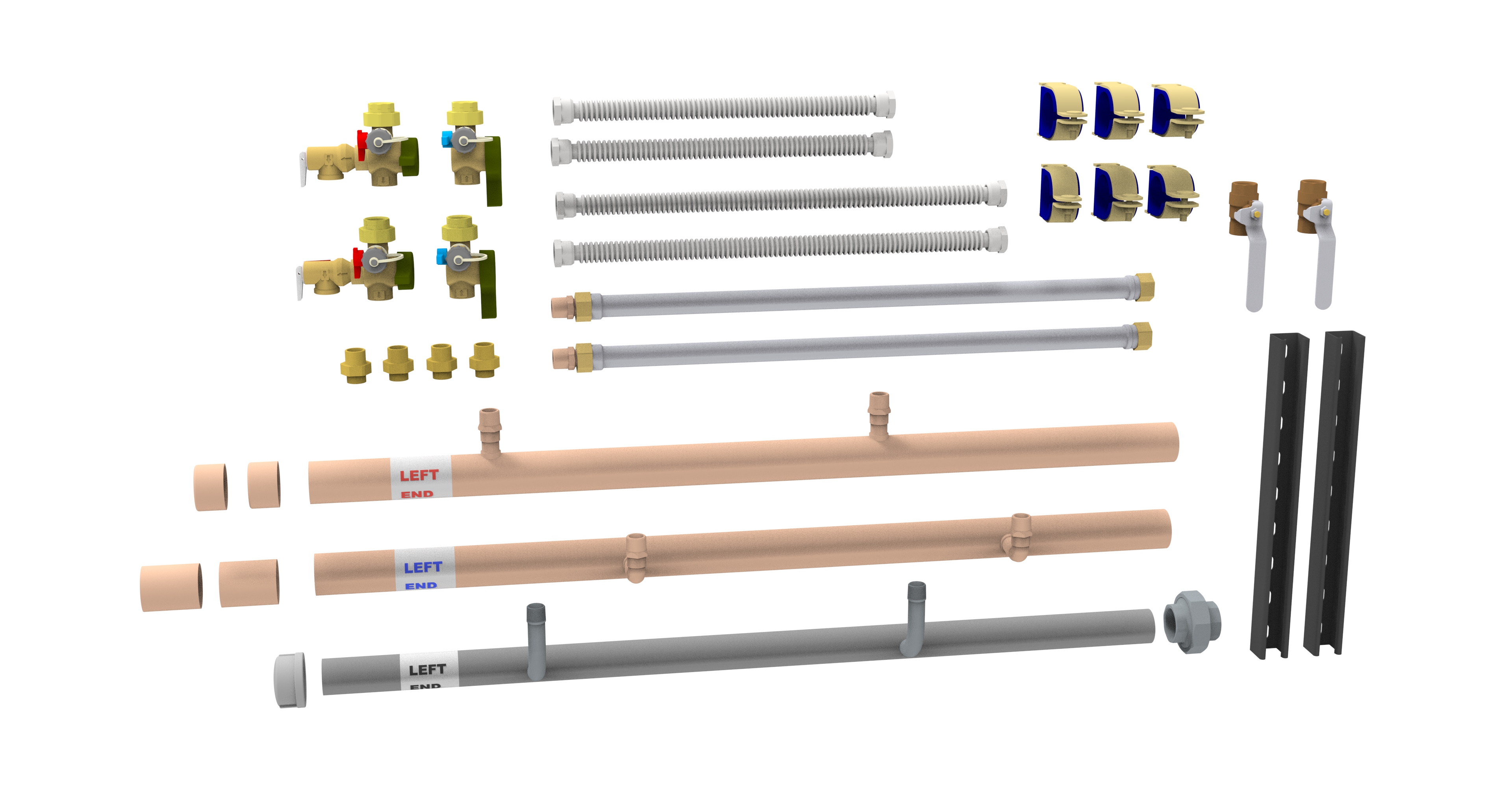 Kit includes: Inlet and outlet water pipe manifolds, gas pipe manifold, 150 psi PRV, shut off valves, end caps, mounting struts and pipe clamps, and coupling, unions and adapters.